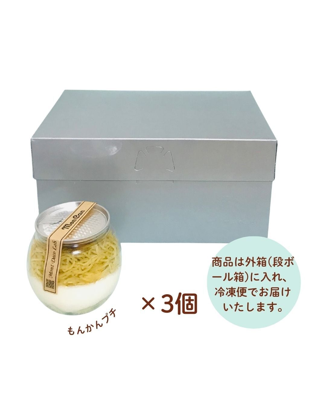 こちらはもんかんプチ3個入りです。商品は冷凍でお届けします。4時間ほど10℃以下の冷蔵庫でゆっくり解凍すると、より美味しくお召し上がりいただけます。解凍後は24時間以内にお召し上がりください。