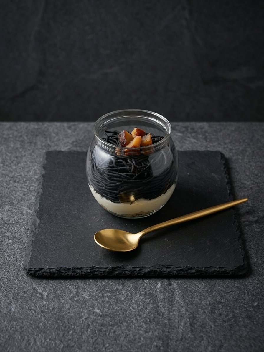 漆黒のペースト、純白の生クリーム、そして柔らかなシフォンケーキ。スプーンを入れるたびに出会う美しいコントラストは、まさに大人のためのデザートです。